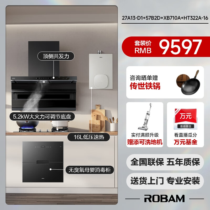 老板(Robam)厨房多件套抽油烟机小黑翼顶侧双吸25风量烟机灶具消毒柜燃气热水器D1+57B2DT+XB710A+HT322A-16价格:9597.00元!