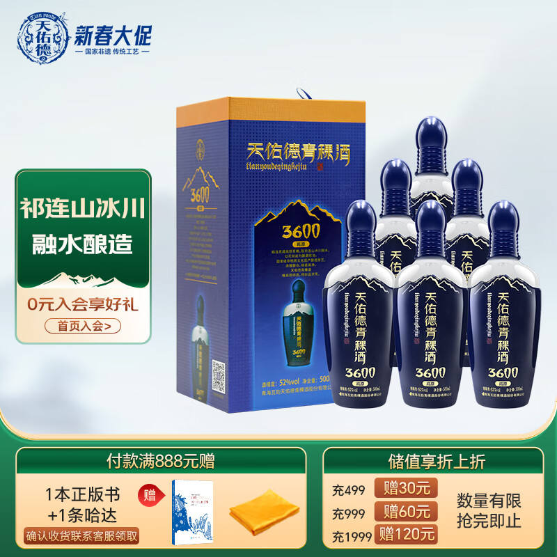 天佑德海拔3600清香型白酒52度500ml*6瓶整箱装【青海青稞酒】价格:1288.00元!