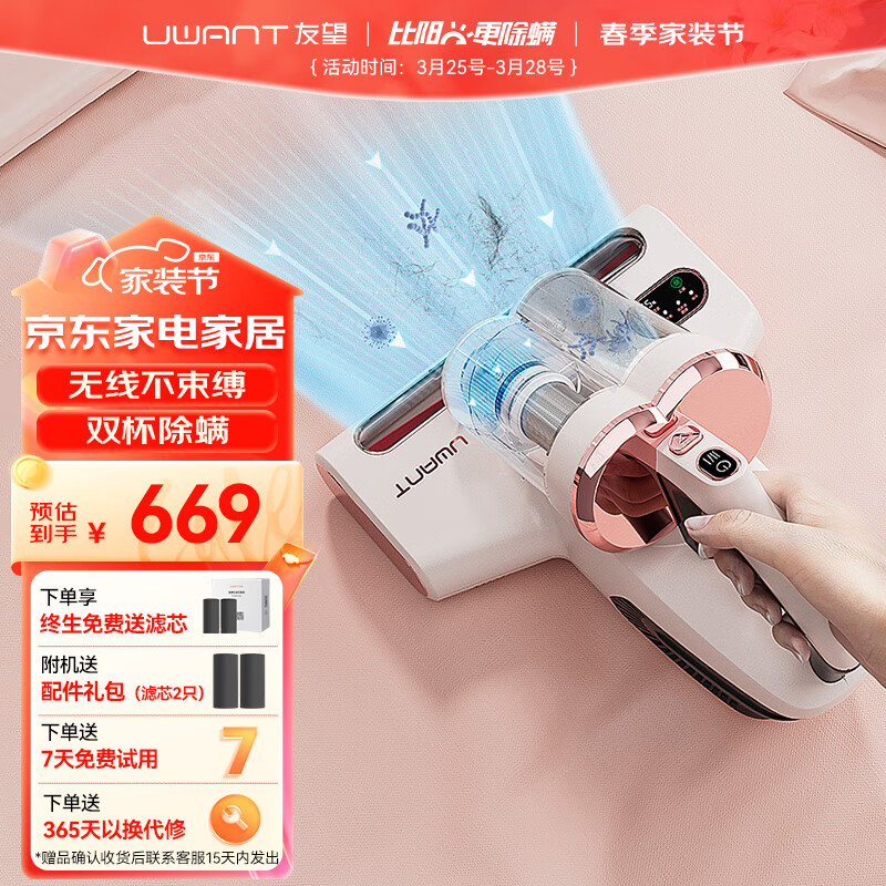 uwant友望除螨仪双杯智能除螨仪家用无线手持除螨机床上超声波紫外线杀菌除螨虫拍打去螨虫M100PRO粉价格:669.00元!