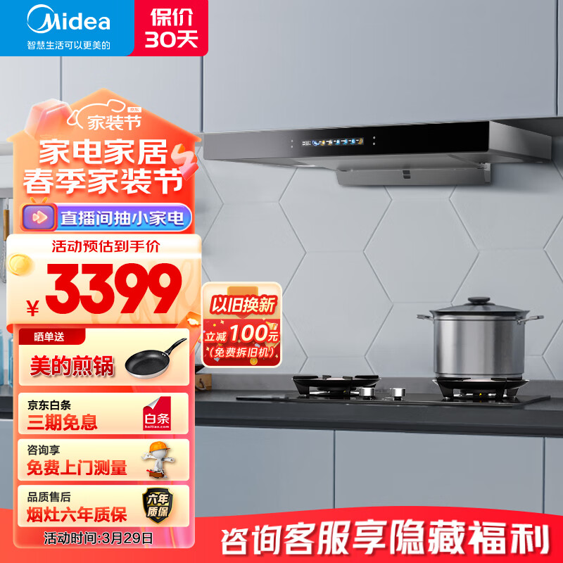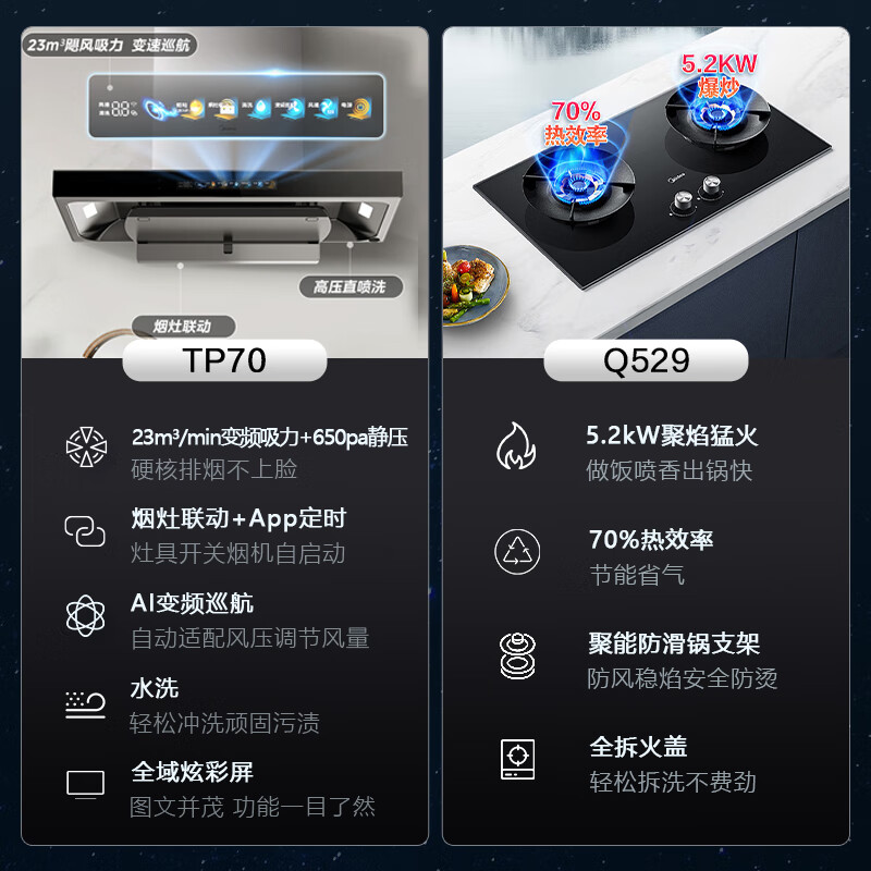 美的(Midea)抽油烟机5.2kW燃气灶家用顶吸23风量变频烟灶联动水洗 烟灶套装TP70+Q529天然气价格:3399.00元!