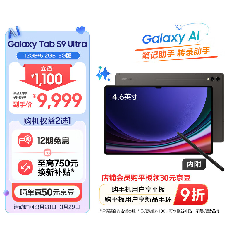 三星(SAMSUNG)S9 Ultra Al智享学习办公平板电脑14.6英寸 120Hz 12G+512GB 5G含Spen AI平板 云影灰价格:9999.00元!