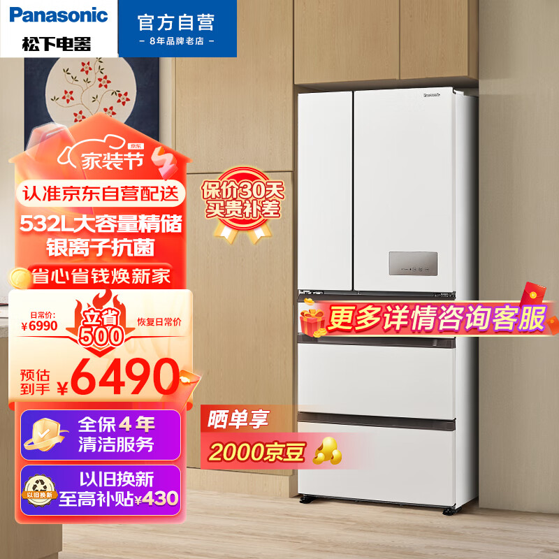 松下(Panasonic)532升家用大容量多门冰箱 银离子kang菌 变频无霜风冷NR-JE54WGC-W价格:6490.00元!