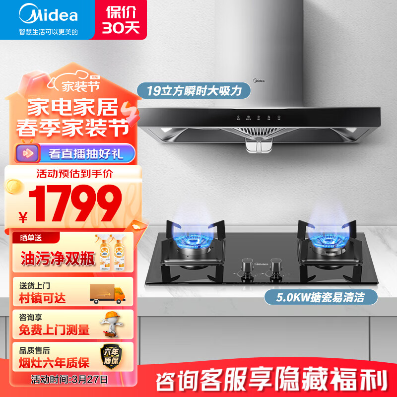 美的(Midea)烟灶套装 小尺寸欧式抽油烟机家用 5KW钢化玻璃双灶 油烟机燃气灶套装T33A+Q330液化气价格:1799.00元!