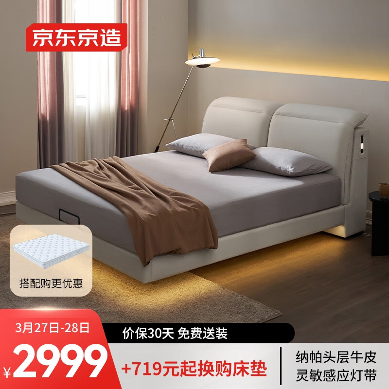 京东京造真皮床 纳帕牛皮|氛围感应灯|可调头枕 主卧双人床1.5米×2米BL08价格:3199.00元!