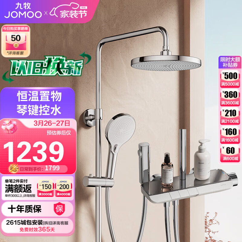 九牧JOMOO恒温花洒全套钢琴按键置物喷枪双增压大顶喷26182-695/1B-1价格:1649.00元!