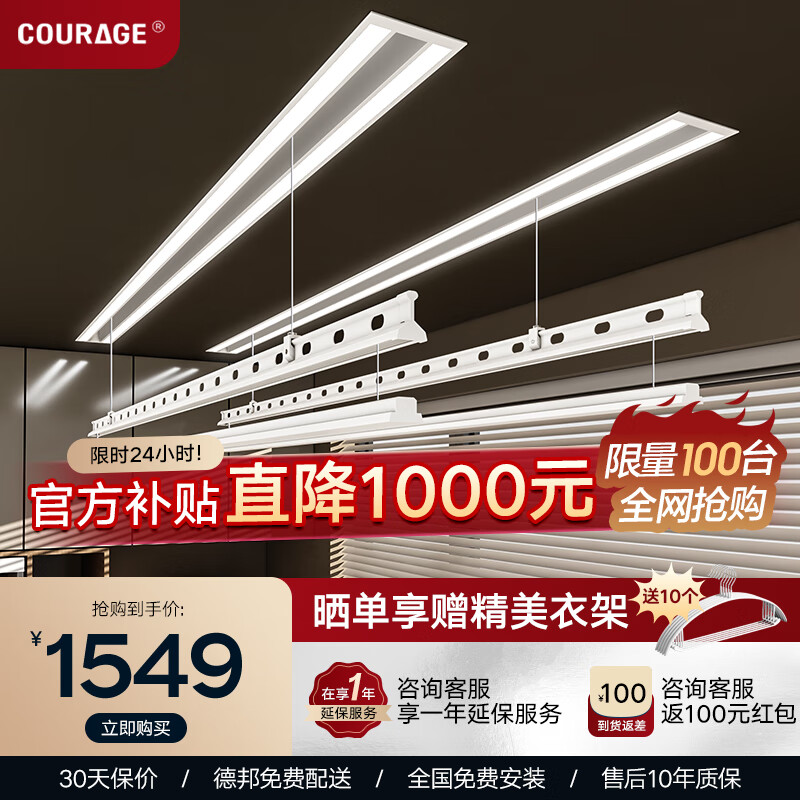 卡瑞琪(COURAGE)电动晾衣架隐形阳台家用隐藏式晾衣架升降晒衣架双杆 1.8米+被杆价格:2549.00元!