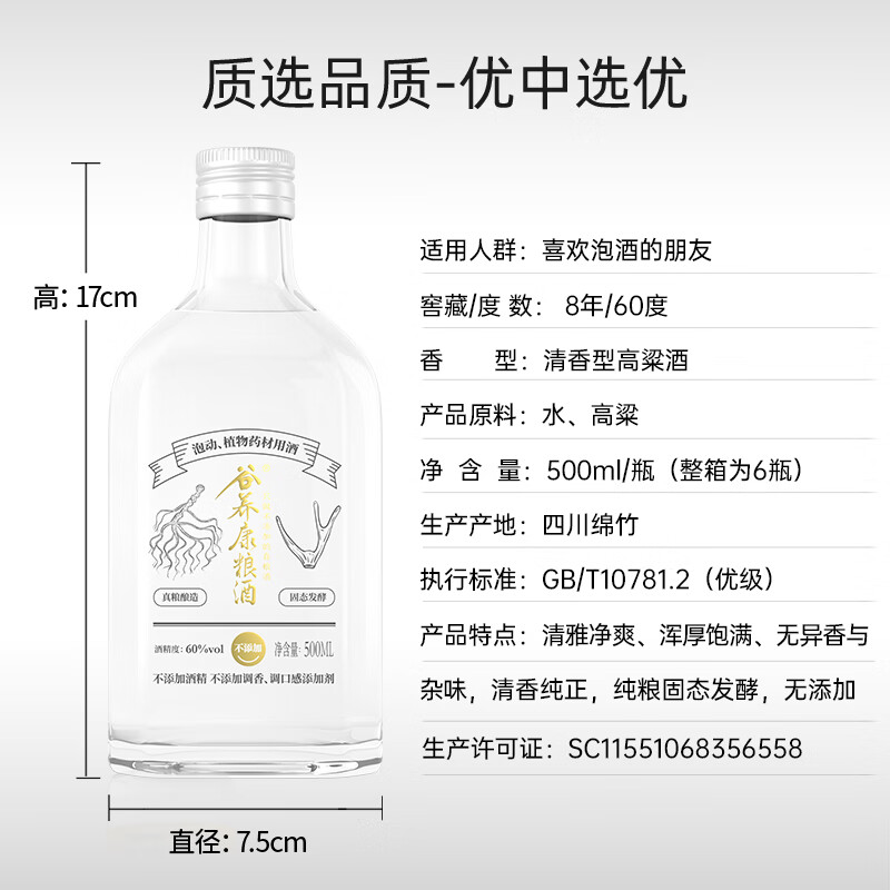 谷养康粮食酒泡酒用酒瓶装清香高粱酒白酒泡果酒泡药酒纯粮酒 60度 500mL 6瓶 【质选】适合动植物价格:1247.00元!