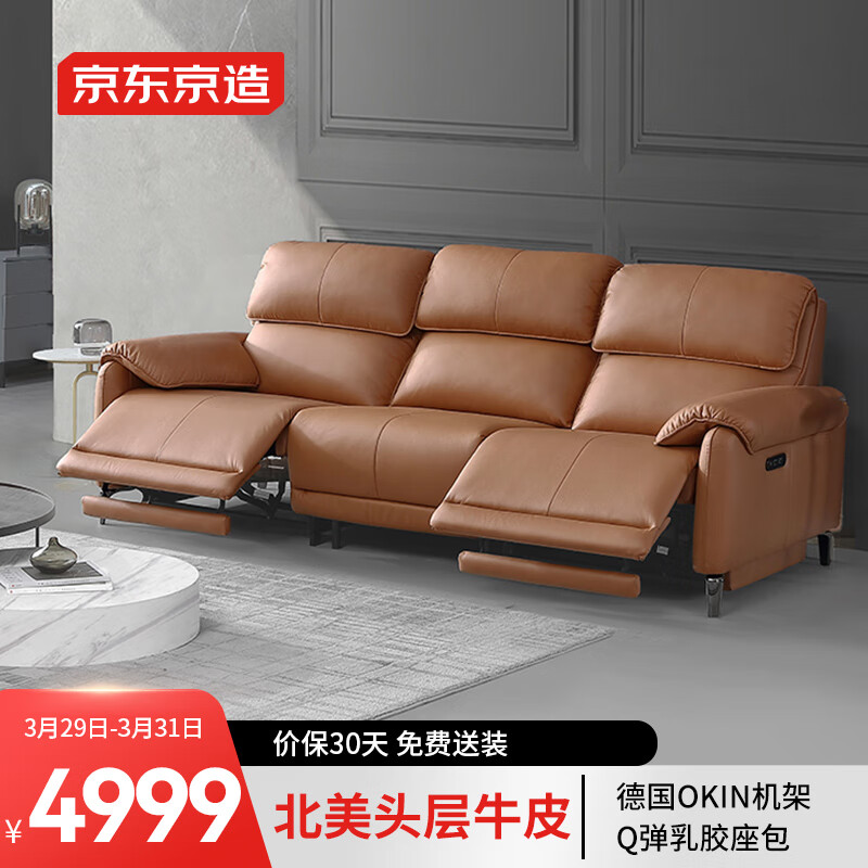 京东京造真皮沙发 头层牛皮|德国OKIN机架|双电动位 客厅大户型2.7m橙SE02价格:5799.00元!