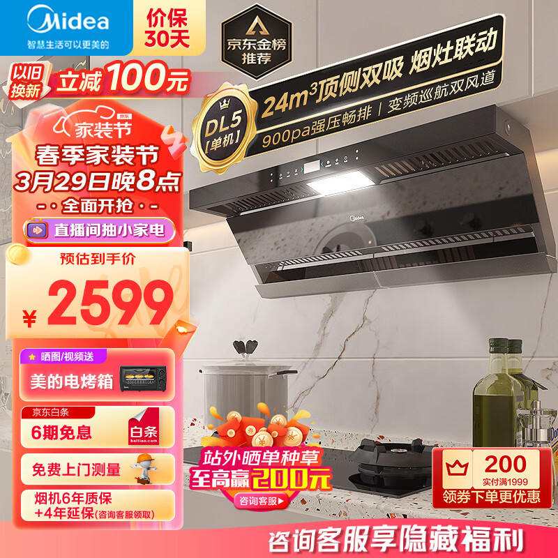美的(Midea)抽油烟机 家用顶侧双吸 烟灶联动 24风量大吸力 变频 超薄近吸 7字型排油烟机 DL5价格:2699.00元!