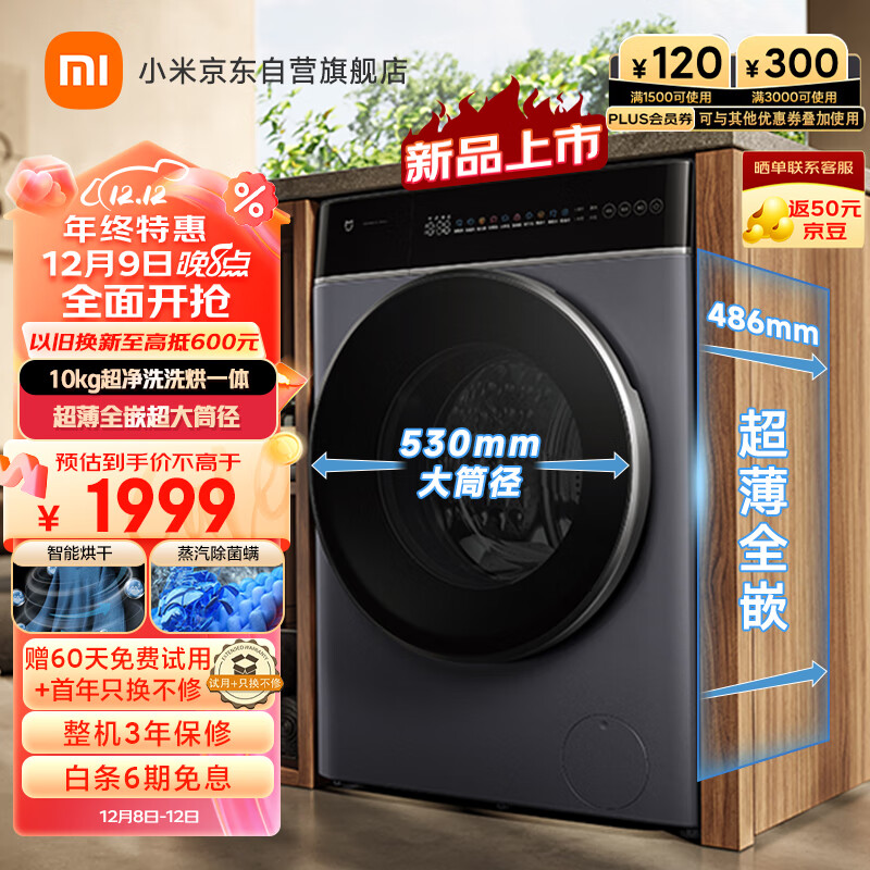 米家小米10公斤超净洗pro滚筒全自动洗烘一体洗衣机 530mm超大筒径超薄机身1.1高洗净比XHQG100MJ301价格:1999.00元!