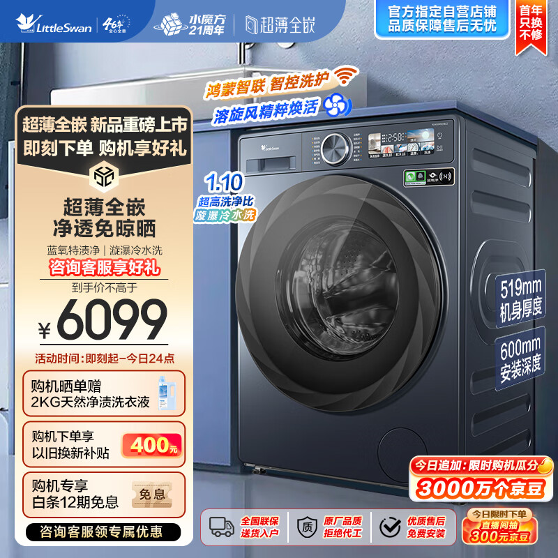 小天鹅(LittleSwan)滚筒洗衣机全自动 洗烘一体机 本色系列【TD100MS09LZ】超薄全嵌 蓝氧特渍净 水魔方 10公斤价格:6299.00元!