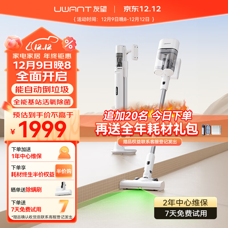 uwant友望吸尘器家用无线手持 巨幕绿光显尘 智能自集尘基站 双尘杯毛发防缠绕 60天免打理尘袋V200价格:1999.00元!