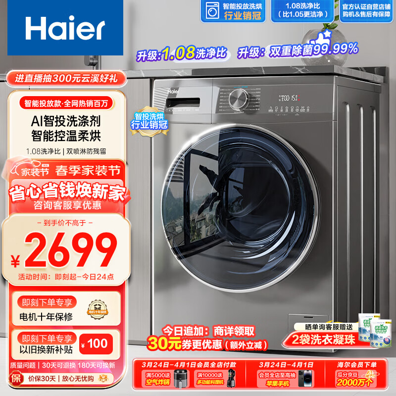 海尔(Haier)滚筒洗衣机全自动 洗烘一体机 10公斤大容量【EG100HMATE55S】1.08洗净比 智投 超薄家用 以旧换新价格:2899.00元!