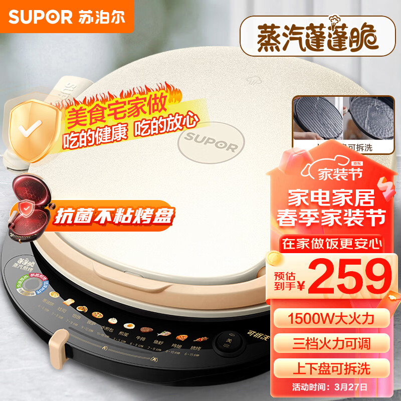 苏泊尔(SUPOR)电饼铛 电饼档 家用双面加热大火力 上下可拆洗 煎饼锅 烙饼锅早餐机多功能蒸汽煎烤机 JD30RQ828价格:259.00元!