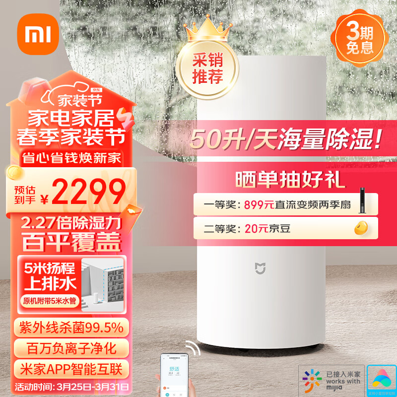 米家小米 除湿机 抽湿机 除湿量50升每天 家用地下室复式别墅商用工业吸湿器 干衣机 APP智能互联价格:2299.00元!