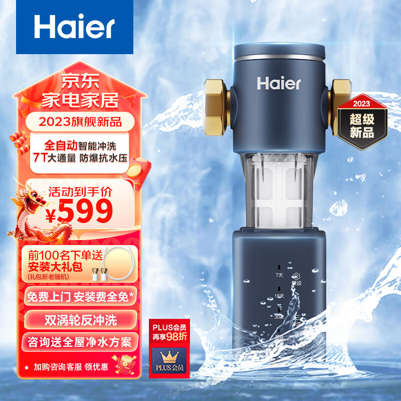 海尔前置过滤器7T大通量家用智能净水器40微米自动反冲洗精滤实时水压监测全屋净水机HQZ50-XFAZ08价格:599.00元!