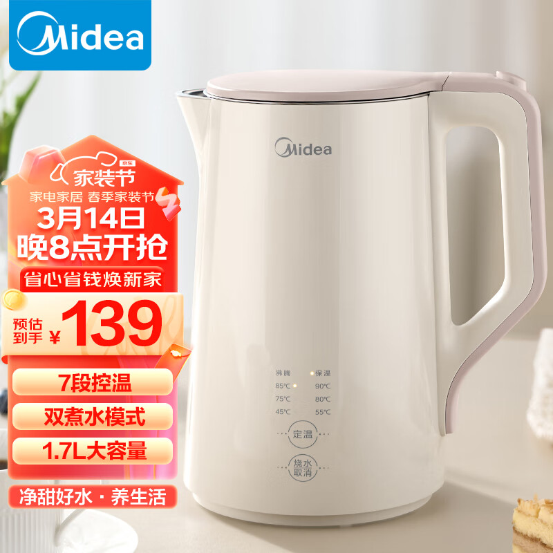 美的(Midea)电热水壶烧水壶1.7L大容量多段控温保温恒温家用开水壶无缝内胆智能自动断电热水壶SHE1732价格:108.00元!