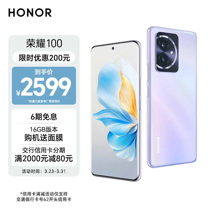 荣耀100 单反级主摄 荣耀绿洲护眼屏 第三代骁龙7 立体声双扬声器 OIS光学防抖 16+256 莫奈紫 5G价格:2799.00元!