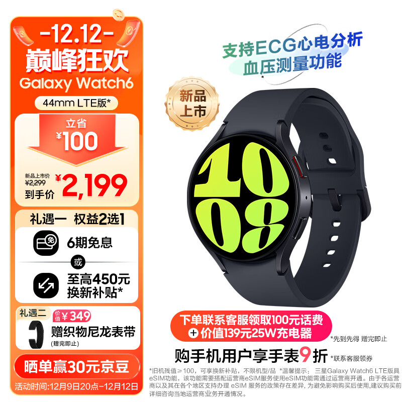 三星Galaxy Watch6 eSIM独立通话/智能手表/运动电话手表/ECG心电分析/血压手表/健康监测 44mm 云影灰价格:2199.00元!
