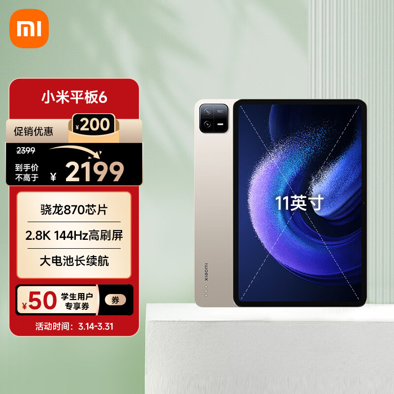 小米平板6 xiaomiPad 11英寸 骁龙870 144Hz高刷2.8K超清 8+256GB 会议笔记移动办公娱乐平板电脑金色价格:2199.00元!