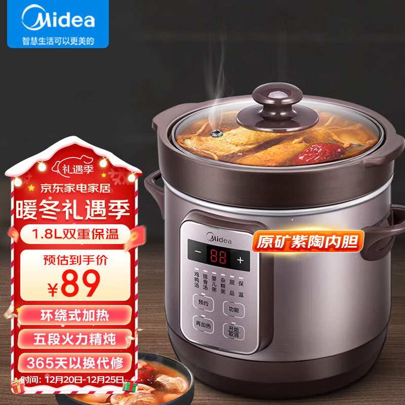 美的(Midea)电炖锅 电炖盅 煲汤锅炖汤锅 电煮锅 紫砂锅 1.8L 智能预约定时保温 DG18Easy201价格:99.00元!