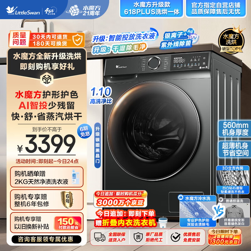 小天鹅(LittleSwan)滚筒洗衣机全自动 洗烘一体机 水魔方【TD100V618PLUS】护形护色 10公斤大容量 智能投放 蒸汽烘干价格:3399.00元!