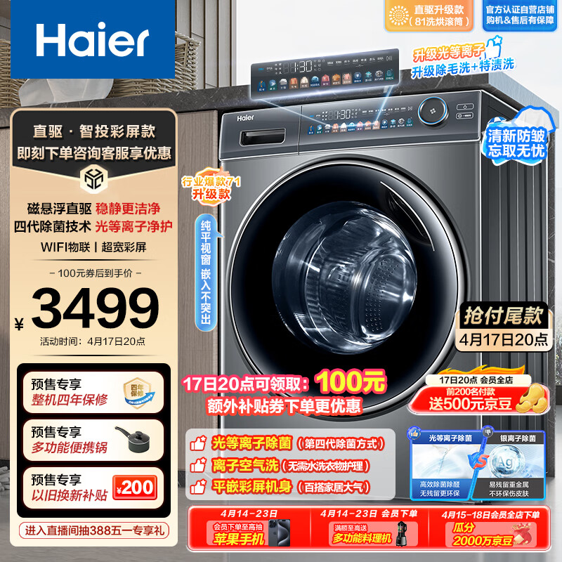 海尔(Haier)滚筒洗衣机全自动 10公斤洗烘一体机 【直驱EG100HMATE81SU1】 光等离子净护 物联 以旧换新家用价格:3598.00元!