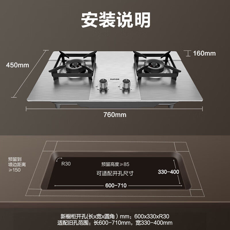 2、之前买的苏泊尔燃气灶用了四年终于寿终正寝了,又买了这款不锈钢台面的灶台希望质量一如既往的好!轻便好安装,火力大点火灵敏,个人觉得很不错!