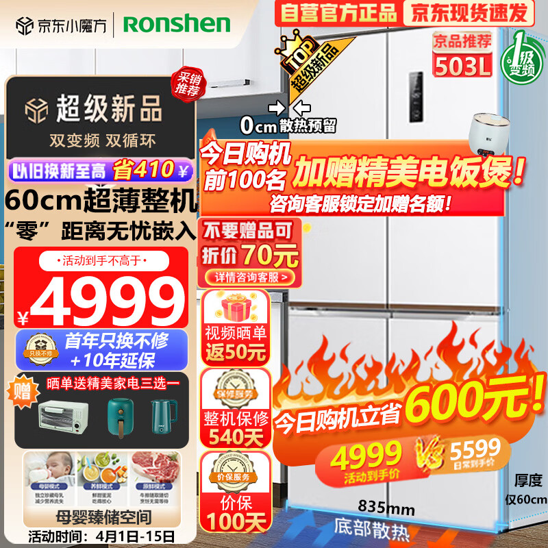 容声(Ronshen)60厘米薄零嵌入式503升十字对开四开门冰箱家用一级能效变频底部散热超薄大容量BCD-503WD1FPQ价格:5599.00元!
