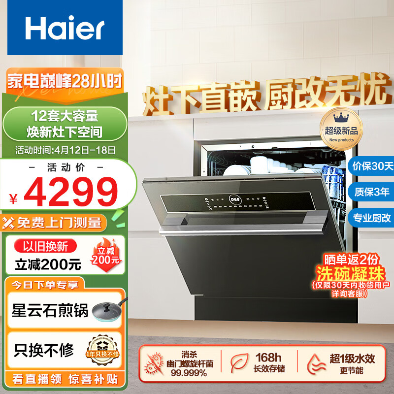 海尔(Haier)12套嵌入式壁嵌家用洗碗机焕新家Z10 洗消一体 高温除菌 一级水效 智能开门速干EBW12327YSU1价格:4269.00元!