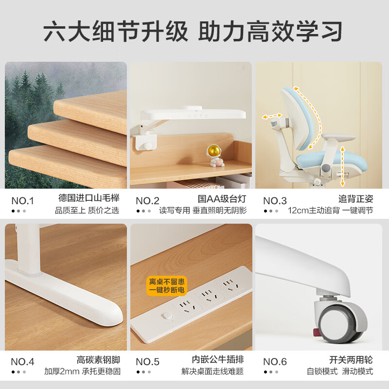 5、椅子坐板是可以前后调节的,图片是调节前的,多大孩子都能坐,大人也可以,特别稳。桌子几乎没有味道,直播间介绍的非常详细非常真实,如果想入手就去直播间看看,那俩主播挺实在。我非常推荐购买,咱就说那七八千的不也是颗粒板吗,为啥你不买京东京造的榉木呢