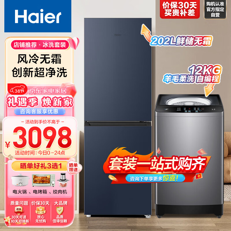 海尔冰洗套装202升双门风冷无霜电冰箱+12公斤家用大容量洗衣机 创新超净洗 以旧换新价格:3098.00元!