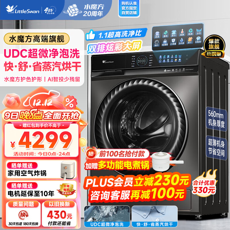小天鹅(LittleSwan)10公斤水魔方小钢炮洗烘一体 滚筒全自动洗衣机 智能投放 UDC净泡洗【v88升级款809】VC189带烘干价格:4299.00元!