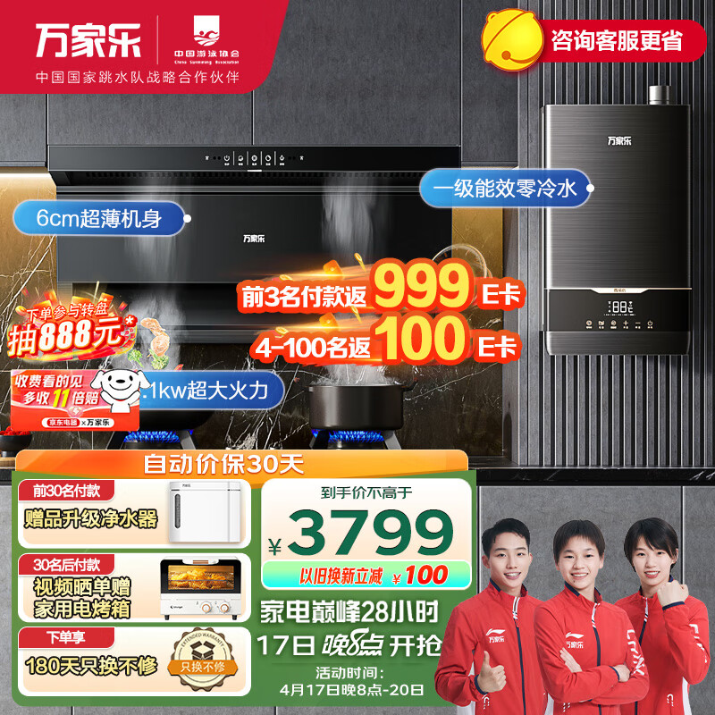 万家乐顶侧双吸油烟机 23立方厨卫烟灶热三件套装 16L一级能效零冷水热水器套装TAK5+TAC5+16DLU3天然气价格:3899.00元!
