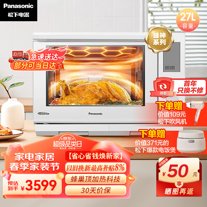 松下(Panasonic)蜂神系列NN-DS2200XPE 27升变频微波炉 微蒸烤炸一体机蜂巢顶聚热旋钮操作智能APP(WIFI)价格:3599.00元!