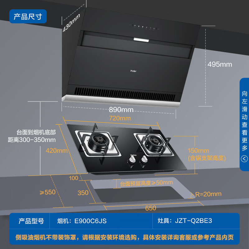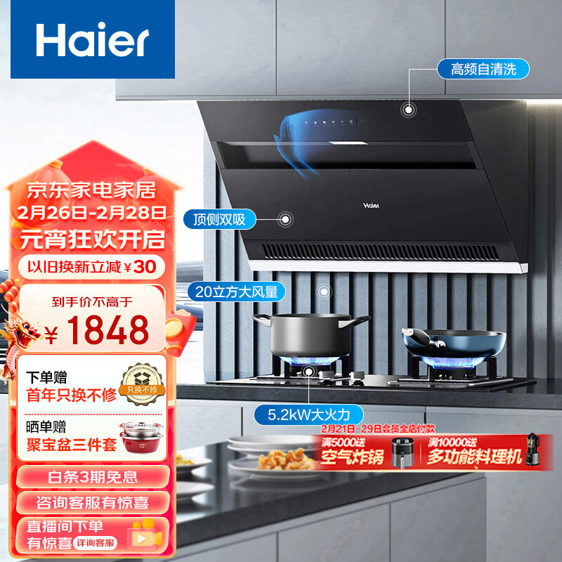 海尔(Haier)抽油烟机 顶侧双吸厨房烟灶套装 20m3/min大吸力 家用侧吸式油烟机灶具套装C6JS+Q2BE3天价格:1848.00元!
