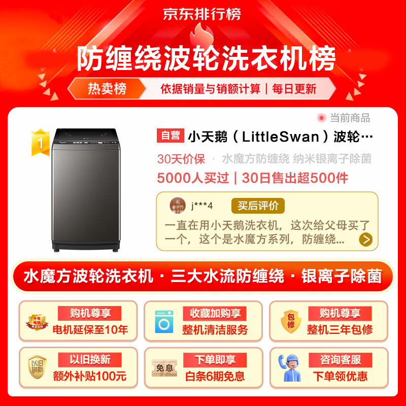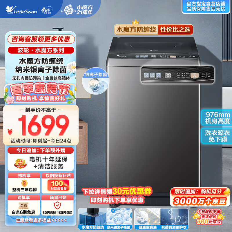 小天鹅(LittleSwan)波轮洗衣机全自动 水魔方系列 【TB100V81T】 防缠绕 纳米银离子除菌 深层除螨 无孔内桶 10公斤价格:1679.00元!