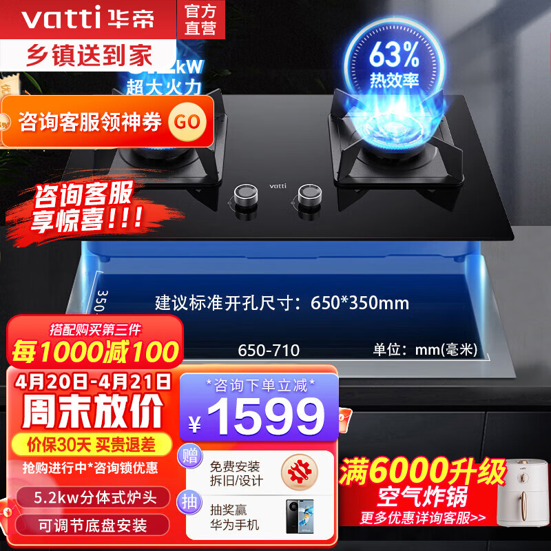 华帝(VATTI)i10075B燃气灶官方5.2kw火力灶具台嵌两用一级能效钢化玻璃可调节安装开孔尺寸 燃气灶 液化气5.0kW价格:1899.00元!