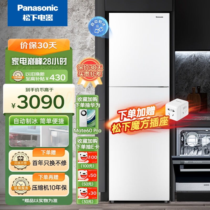 松下(Panasonic)303升三门冰箱京东小家智能生态一级能效银离子kang菌自动制冰家用冰箱NR-JS30AX1-W优选以旧换新价格:3090.00元!