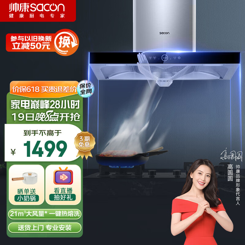 帅康(Sacon)抽油烟机 21大风量家用欧式吸油烟机挥手智控自动清洗T8088价格:1499.00元!