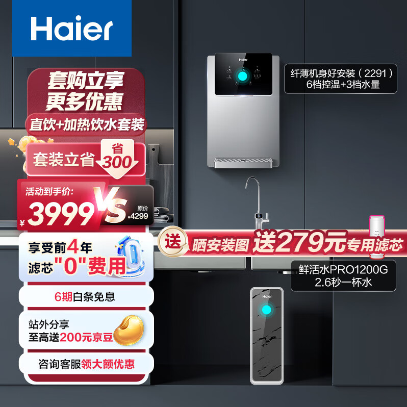 海尔(Haier)净水器1200G鲜活水pro 6年RO反渗透过滤器厨下直饮净水器+管线机HKC3000-R793D2U1+R2291价格:3999.00元!