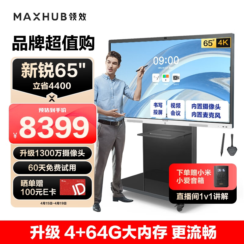 maxhub会议平板V6新锐65英寸 触摸视频会议电视一体机 投屏电视智慧屏 E65+商务支架+传屏+笔 商用显示价格:8399.00元!