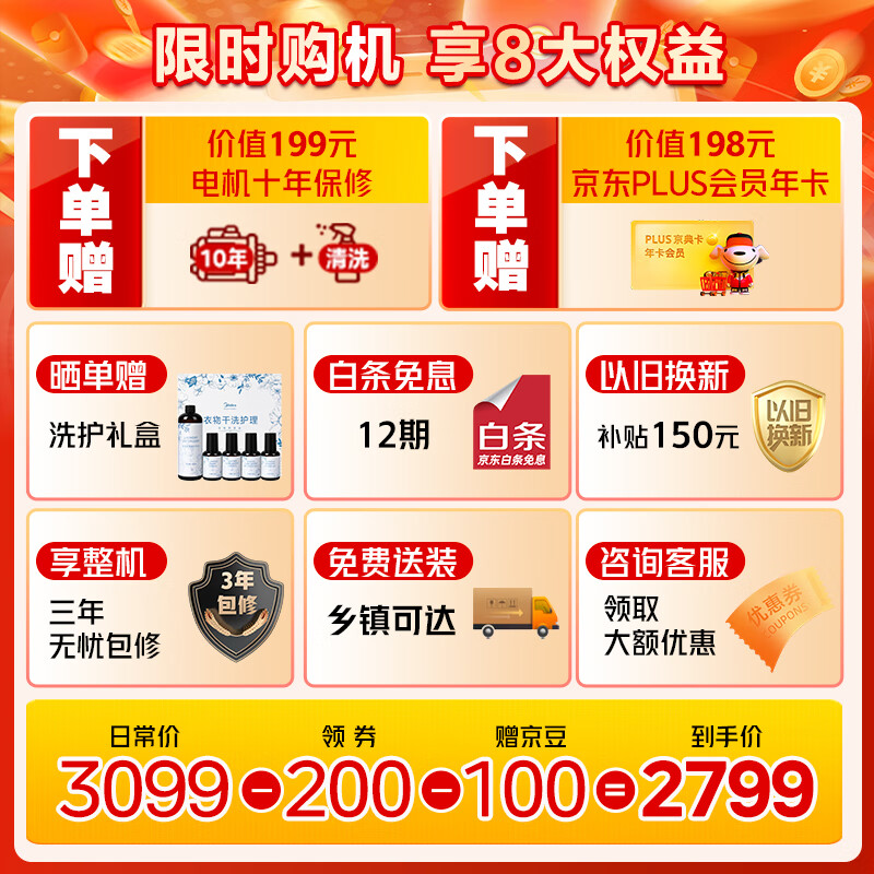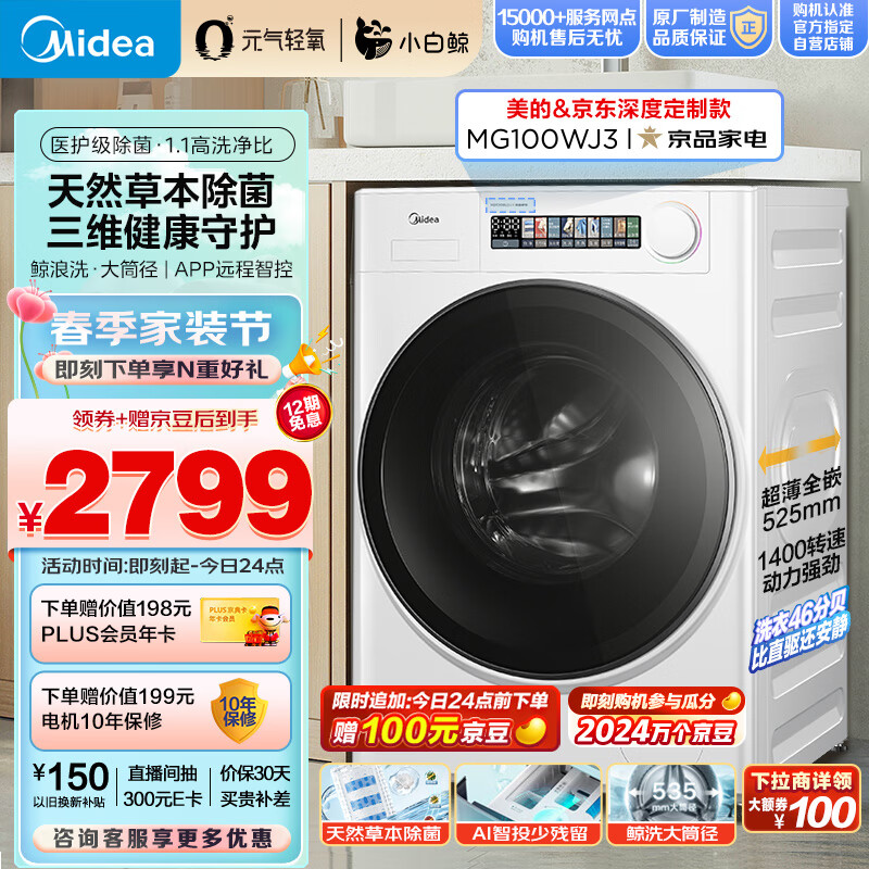 美的(Midea)滚筒洗衣机全自动 元气轻氧系列 小白鲸 MG100WJ3 天然草本除菌 超薄全嵌 1.1洗净比 鲸浪洗10公斤价格:3099.00元!