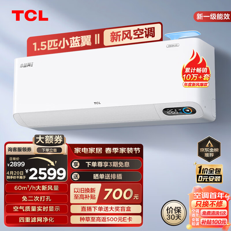 TCL新风空调1.5匹新一级 变频冷暖60m3/h大新风量小蓝翼Ⅱ卧室挂机 KFRd-35GW/D-SWA11Bp(B1)一价全包价格:2599.00元!