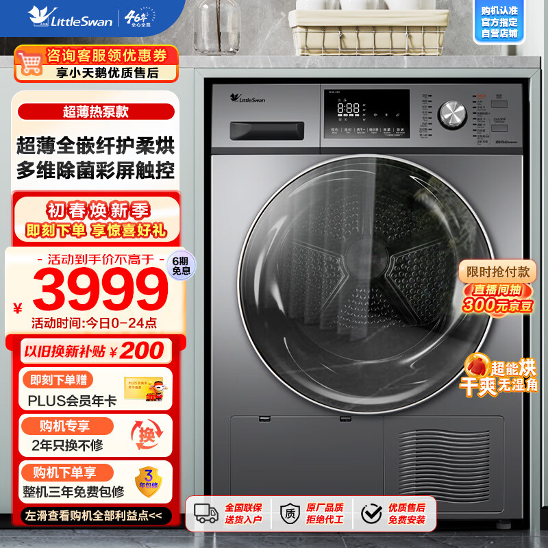 小天鹅(LittleSwan) 烘干机 家用 干衣机 热泵式紫外线除菌 衣干即停 快烘20分钟 10公斤 TH100-H32Y价格:3999.00元!