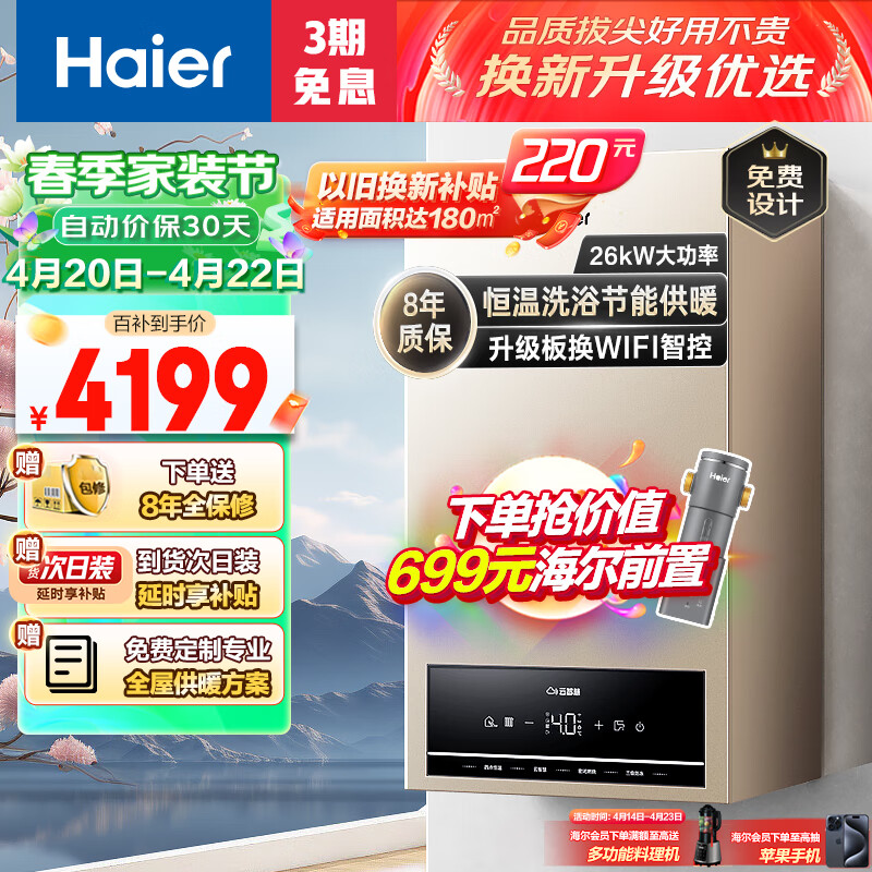 海尔(Haier)燃气壁挂炉天然气板换式采暖炉家用地暖供暖全屋热水智慧节能 WIFI智控多点恒温L1PB26-HJ5ACHMU1价格:4199.00元!