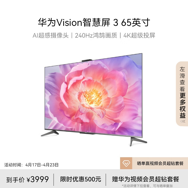 华为Vision智慧屏 3 65英寸 Pura 70投屏好搭档 AI摄像头240Hz屏超高清智能液晶电视机HD65QINA价格:3999.00元!