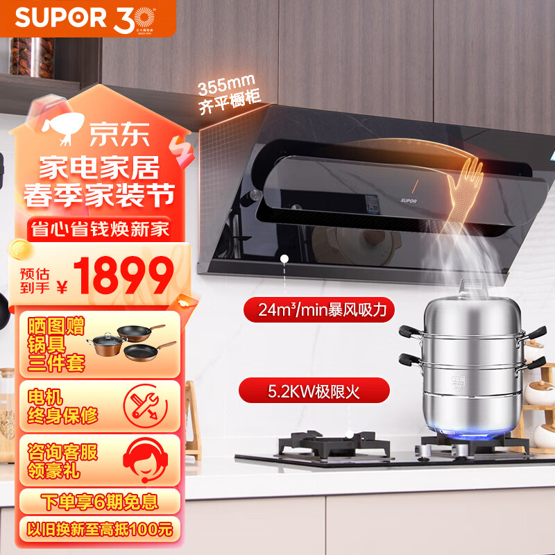苏泊尔(SUPOR)抽油烟机 24m3/min大吸力 变频侧吸式脱排抽吸油烟机家用 挥手智控免拆洗烟灶套装 DJ50S+DB28液价格:1899.00元!