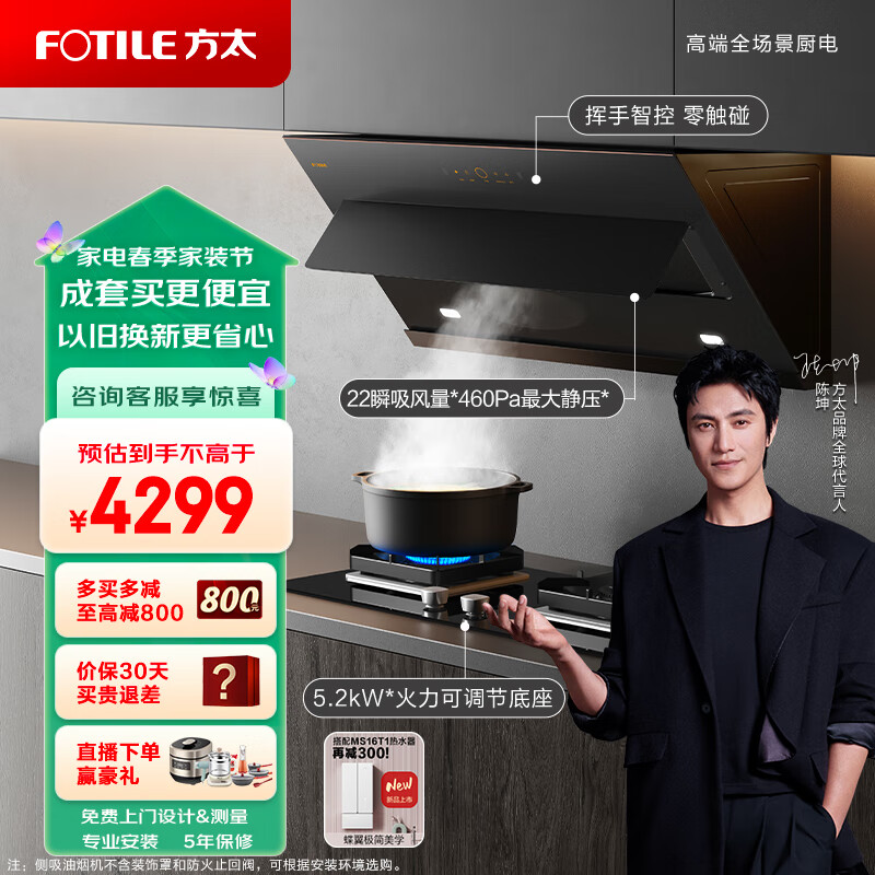 方太(FOTILE)抽吸油烟机灶具套装 侧吸式烟灶套装智能挥手22大风量5.2kW猛火燃气双灶家用静音 JCD9A+02-TH27B价格:4299.00元!