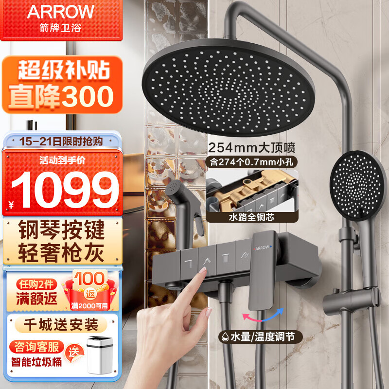 箭牌(ARROW) 淋浴花洒套装增压花洒全套莲蓬头淋雨器套装浴室花洒按键花洒 【枪灰色】按键丨冷热款价格:1099.00元!
